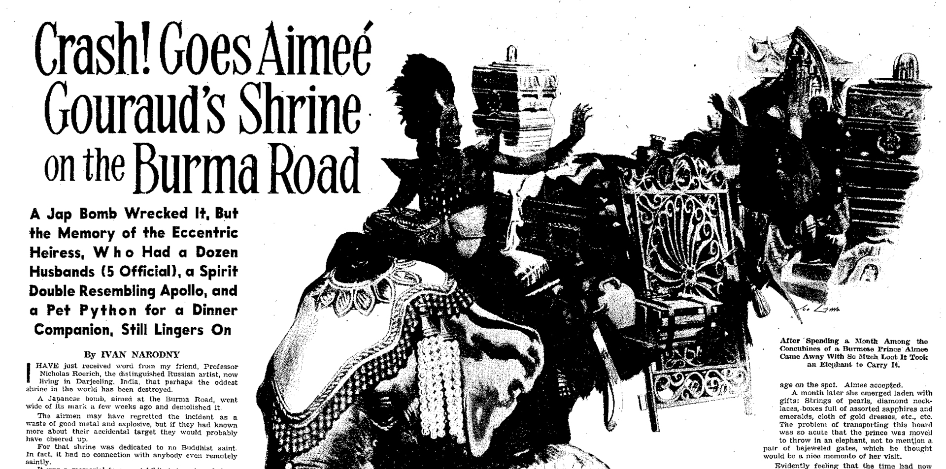 Archives Crash! Goes Aimée Gouraud’s Shrine on the Burma Road 03/29/2019 by Kevin Taylor View Article: Aimee’s death PH Crash Goes the Shine San Antonio Light 5-10-1942a Tags:Aimée Crocker
